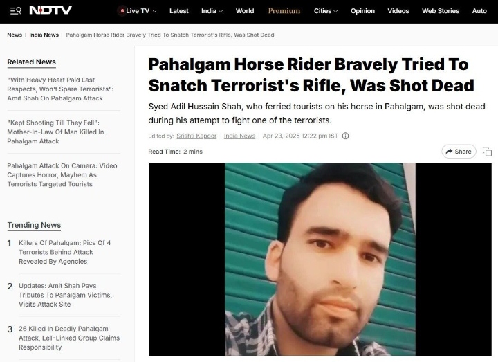 మంగళవారం పహల్గామ్ లో పాకిస్తాన్ ఉగ్రవాదులు జరిపిన మారణ హోమంలో కాశ్మీర్ యువకుడు సయ్యద్ ఆదిల్ హుస్సేన్ షా సమిధ అయ్యాడు.