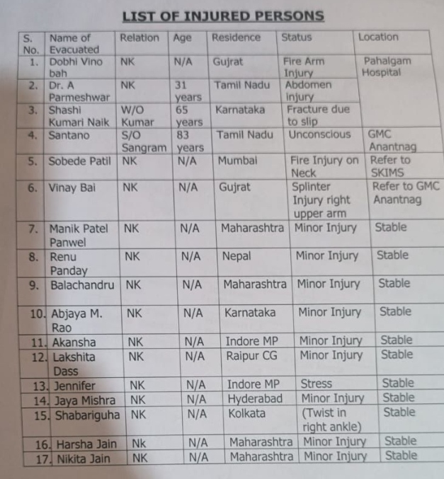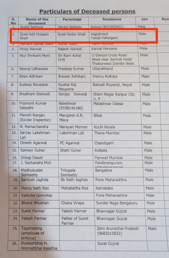 ఉగ్రవాదుల కాల్పుల్లో మృతి చెందిన 26 మంది పేర్లు, ప్రాంతాల, వివరాలతో అధికార యంత్రాంగం విడుదల చేసిన ప్రకటనలో రెండవ వ్యక్తి ముస్లిం ఉన్నాడు.