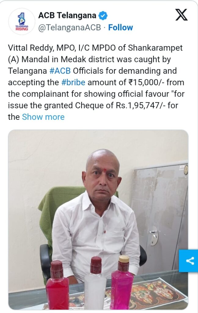 మెదక్ జిల్లాలోని శంకరంపేట (ఎ) మండల ఇంచార్జ్ మండల పరిషత్తు అభివృద్ధి అధికారి, మండల పంచాయతీ అధికారి విఠల్ రెడ్డి ఏసీబీకి చిక్కారు.