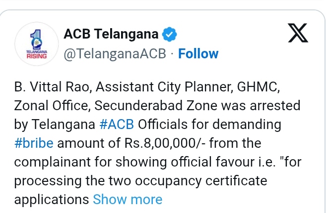 సికింద్రాబాద్ ప్రాంతీయ కార్యాలయములోని సహాయక టౌన్ ప్లానర్ బి. విఠల్ రావును ఏసీబీ అధికారులు అరెస్ట్ చేశారు. ఫిర్యాదుదారునికి చెందిన రెండు భవనాలకు సంబంధించిన ఆక్యుపెన్సీ ధ్రువీకరణ పత్రాలను అందించడానికి” సహాయం చేసేందుకు ₹ 8 లక్షల రూపాయల లంచం డిమాండ్ చేసి, అందులో ఇప్పటికే ₹ 4 లక్షల రూపాయలు తీసుకున్నాడు.