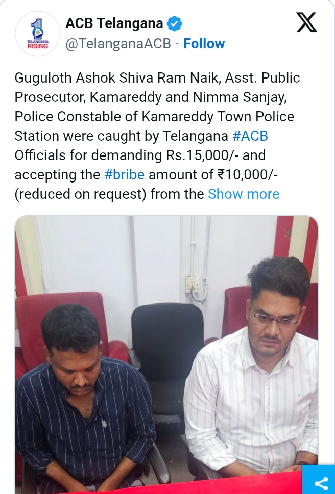 కామారెడ్డి పట్టణ పోలీస్ స్టేషన్ లో నమోదైన ఒక కేసుకు సంబంధించి విచారణను త్వరగా పూర్తి చేసి, నిర్దోషిగా విడుదల చేయడానికి” కామారెడ్డి లోని సహాయ పబ్లిక్ ప్రాసిక్యూటర్ – గుగులోత్ అశోక్ శివ రామ్ నాయక్, కామారెడ్డి టౌన్ పోలీస్ స్టేషన్ పోలీస్ కానిస్టేబుల్ నిమ్మ సంజయ్లు ₹15,000/- లంచం డిమాండ్ చేసి, అభ్యర్థన మేరకు ₹10,000/- తగ్గించి తీసుకుంటుండగా ఏసీబీ అధికారులకు పట్టుబడ్డారు.