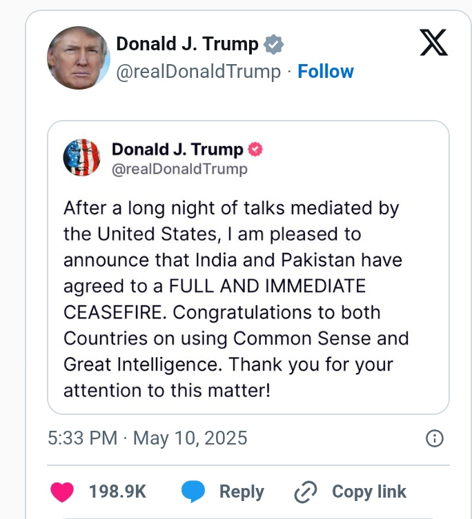 “అమెరికా సంయుక్త రాష్ట్రాల మధ్యవర్తిత్వంలో జరిగిన సుదీర్ఘ రాత్రంతా చర్చల తర్వాత, భారతదేశం మరియు పాకిస్తాన్ పూర్తి మరియు తక్షణ ఒప్పందం కుదుర్చుకున్నాయని ప్రకటించడానికి నేను సంతోషంగా ఉన్నాను. సాధారణ జ్ఞానం మరియు గొప్ప తెలివితేటలను ఉపయోగించిన రెండు దేశాలకు అభినందనలు.