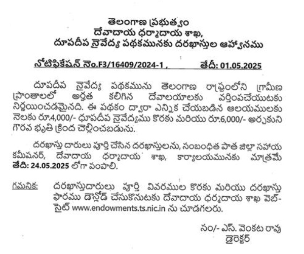 రాష్ట్రంలో గ్రామీణ ప్రాంతాలలో అర్హత కలిగిన దేవాలయాల నుంచి ధూపదీప నైవేధ్య పథకానికి దరఖాస్తులు చేసుకోవాలని తెలంగాణ దేవాదాయ శాఖ డైరెక్టర్ వెంకట్రావు మే 1న అధికారిక ఉత్తర్వులు జారీ చేశారు.