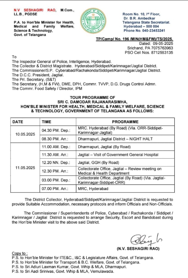 అనంతరం జగిత్యాల లో వైద్య ఆరోగ్యశాఖ సమీక్ష సమావేశంలో పాల్గొన్నారు. ఈ మేరకు మంత్రి దామోదర రాజనర్సింహ పర్యటన వివరాలు అధికారికంగా ప్రభుత్వం ప్రకటనలో పేర్కొంది.