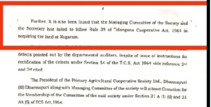 సహకార శాఖ పరమైన ఆడిట్ లో ధర్మపురి సొసైటీ నాగారంలో కొనుగోలు చేసిన భూమి గూర్చి అనేకసార్లు అభ్యంతరాలు వ్యక్తం చేస్తూ పాలకవర్గాన్ని, అధికారులను వివరణ కోరుతూ నోటీసులు పంపిన, పాలకవర్గం స్పందించడం లేదు.