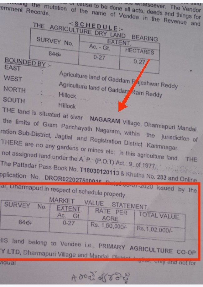 👉 భూ విక్రయ పట్టేదారుకు, లక్షలాది రూపాయల సొసైటీ సొమ్ము చెల్లించారు. ఒప్పందం మేరకు ఎకరం భూమి సొసైటీ కి రిజిస్ట్రేషన్ కావాల్సి ఉండగా కేవలం 0 – 27 , గుంటల భూమి, తేదీ 6-7-2020 న డాక్యుమెంట్ నెంబర్ 4052/2020 జగిత్యాల్ సబ్ రిజిస్టర్ కార్యాలయంలో సొసైటీ పేరున రిజిస్టర్ అయింది.