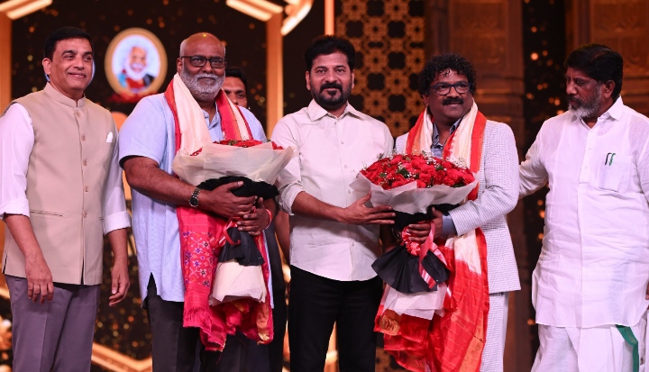 👉 ఆస్కార్ అవార్డు గ్రహీతలు చంద్రబోస్ , ఎంఎం కీరవాణి లనుఈ వేదికగా ముఖ్యమంత్రి సత్కరించారు. గద్దర్ జయంతి వేడుకల నిర్వహణలో భాగస్వామ్యం కల్పిస్తూ ప్రభుత్వం తరఫున మూడు కోట్ల రూపాయలకు సంబంధించిన పత్రాన్ని గద్దర్ ఫౌండేషన్ సూర్యకిరణ్ కు అందజేశారు.