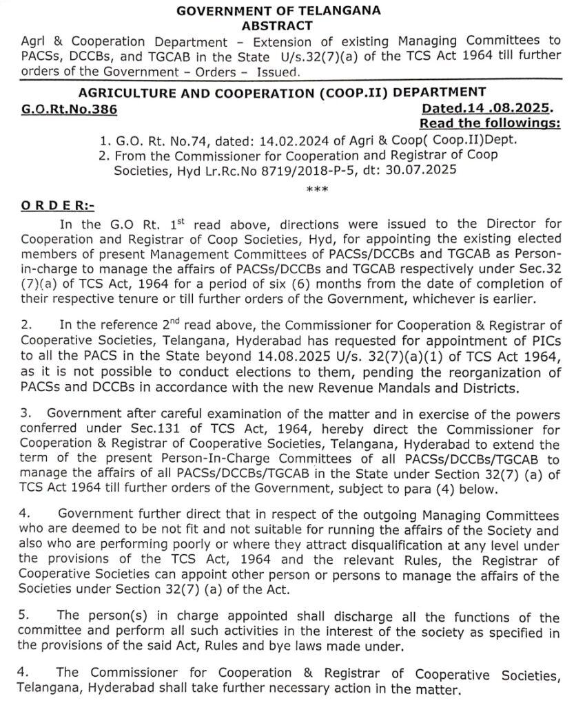రాష్ట్రవ్యాప్తంగా సింగిల్ విండో ల ( పిఎసిసిఎస్, డిసిసిబి ) ఆ పదవి కాలం 6 నెలల పొడిగిస్తూ రాష్ట్ర తెలంగాణ రాష్ట్ర ప్రభుత్వ కార్యదర్శి రఘునందన్ రావు, గురువారం, జీవో ఆర్ టీ సంఖ్య