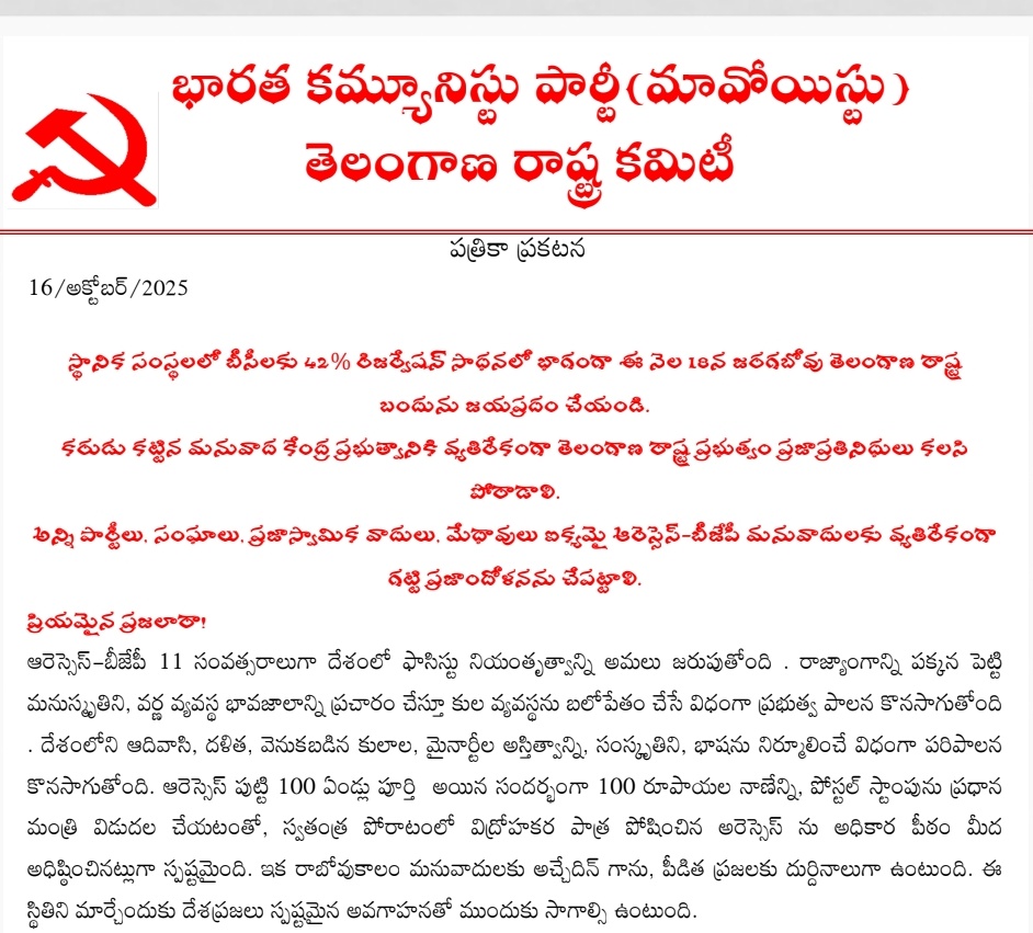 స్థానిక సంస్థలలో బీసీలకు 42% రిజర్వేషన్ సాధనలో భాగంగా ఈ నెల 18 న జరగబోవు తెలంగాణ రాష్ట్ర బందును జయప్రదం చేయండి. అంటూ మావోయిస్టు పార్టీ అధికార ప్రతినిధి జగన్ ప్రకటనలో పిలుపునిచ్చారు.