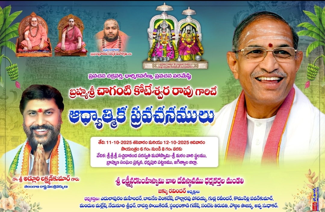 ఈనెల 11మరియు 12 రెండు(2) రోజులు ధర్మపురి క్షేత్రములో ప్రవచన కార్యక్రమము నిర్వహించుటకు చాగంటి కోటేశ్వరరావు సమ్మతించారు.సాయంత్రం 6 గంటల నుండి 8 గంటల వరకు ప్రవచన కార్యక్రమం నిర్వహించనున్నారు.