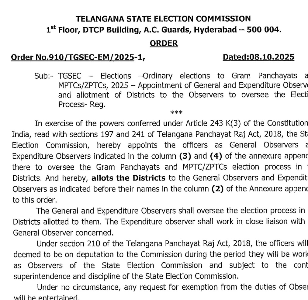 జగిత్యాల జిల్లా లో గ్రామ పంచాయతీలకు సాధారణ ఎన్నికలు మరియు MPTCS/ZPTCS, 2025 ఎన్నికల ప్రక్రియను పర్యవేక్షించడానికి సాధారణ మరియు వ్యయ పరిశీలకుల ను ప్రభుత్వం గురువారం ఉత్తర్వు సంఖ్య 910/TGSEC-EM/2025-1 ద్వారా ఎన్నికల సంఘ కార్యదర్శి మకరందం నియమిస్తూ ఉత్తర్వులు జారీ చేశారు.