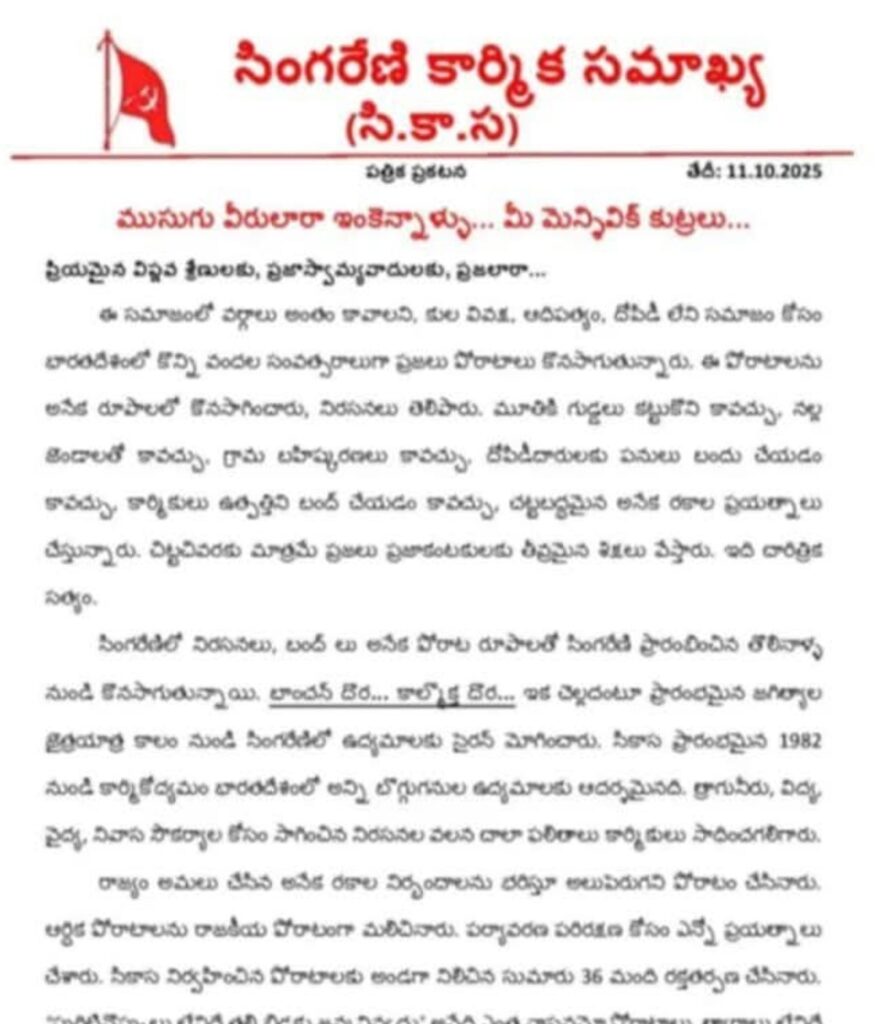 మీకు ఏమాత్రమైనా అమరుల త్యాగాలపైన ఏ మాత్రమైనా గౌరవం ఉంటే తప్పుడు ఆలోచనలు, విధానాలు మానుకోవాలని విజ్ఞప్తి చేస్తున్నాము. అంటూ తదితర అంశాలు సింగరేణి కార్మిక సమైక్య కార్యదర్శి అశోక్ విడుదల చేసిన లేఖలో పేర్కొన్నారు.