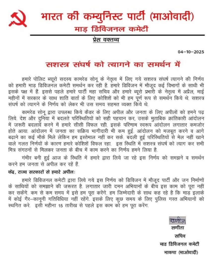 కేంద్ర కమిటీ సభ్యుడు, అధికార ప్రతినిధి మల్లోజుల వేణుగోపాల్, @ అభయ్, @ సోను, రేపో మాపో, ప్రభుత్వానికి లొంగిపోనున్నారు అనేది బహిరంగ రహస్యమే అయితే లొంగుబాటు ప్రక్రియ లో ఆలస్యం ఎందుకు అనేది చర్చ. మల్లోజు వేణుగోపాల్ బాటలోనే మేము పయనిస్తామంటూ దండకారణ్యంలో మాడ్ డివిజనల్ కమిటీ కార్యదర్శి రాణితసనిత మంగళవారం ప్రకటన జారీ చేశారు.