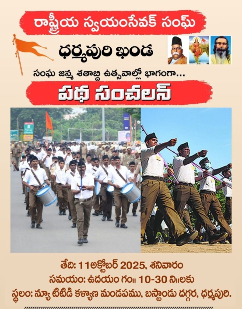రాష్ట్రీయ స్వయం సేవక్ సంఘ శతాబ్ది ఉత్సవాల్లో భాగంగా శనివారం ధర్మపురి పట్టణ పుర విధుల్లో స్వయం సేవకుల పథ సంచలన్ (రూట్ మార్చ్) జరగనున్నది.