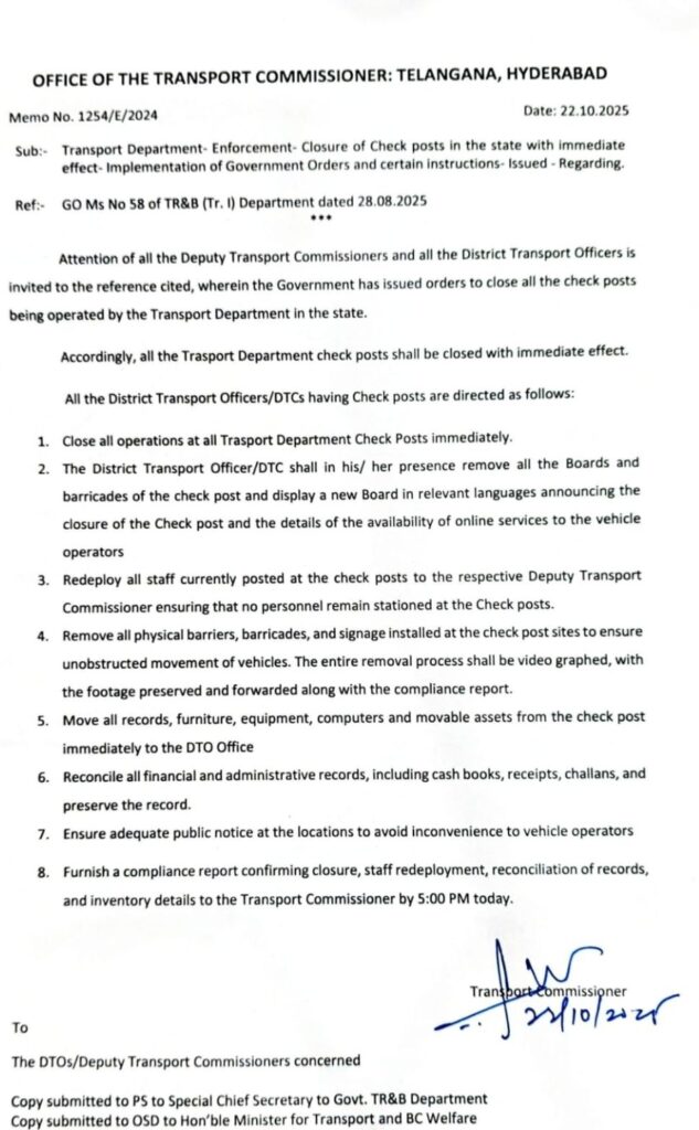 రాష్ట్రంలో చెక్ పోస్టుల మూసివేత తక్షణమే అమలులోకి వస్తుందని కమిషనర్ ఉత్తర్వుల్లో పేర్కొన్నారు. జిల్లా రవాణా అధికారి/DTC తన సమక్షంలో చెక్ పోస్ట్ అన్ని బోర్డులు, బారికేడ్లను తొలగించి, చెక్ పోస్ట్ మూసివేయాలి.