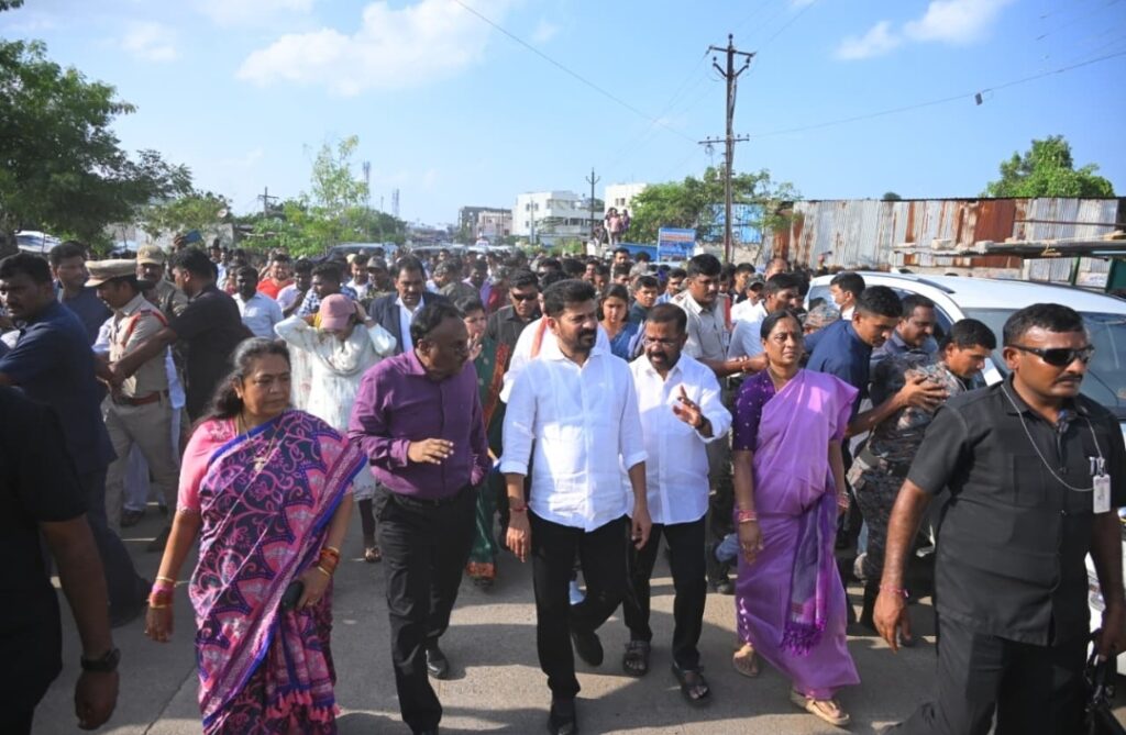 వరదలతో దెబ్బతిన్న ప్రాంతాలను ముఖ్యమంత్రి రేవంత్ రెడ్డి క్షేత్రస్థాయిలో పరిశీలించారు. వరద ప్రభావిత ప్రాంతాల్లో ఏరియల్ పరిశీలన అనంతరం, హనుమకొండ చేరుకున్న ముఖ్యమంత్రి పట్టణంలోని సమ్మయ్య నగర్, కాపువాడ, పోతననగర్ తదితర ప్రాంతాల్లో పర్యటించారు.