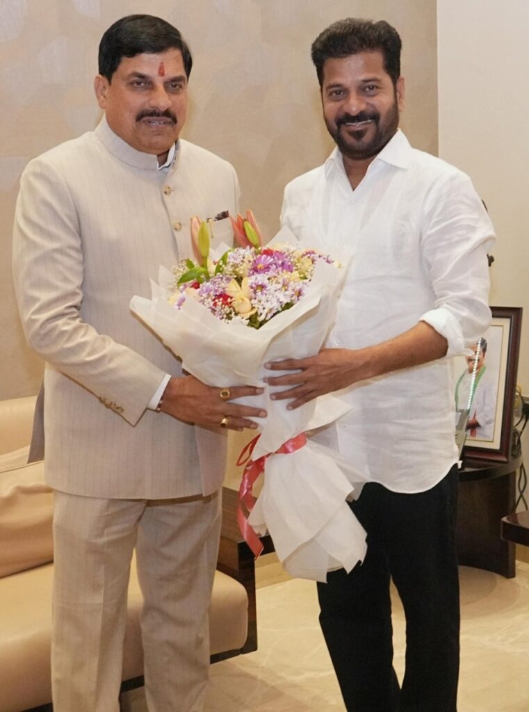 మధ్యప్రదేశ్ ముఖ్యమంత్రి మోహన్ యాదవ్ , తెలంగాణ ముఖ్యమంత్రి రేవంత్ రెడ్డిని మర్యాద పూర్వకంగా కలిశారు. జూబ్లీహిల్స్లోని సీఎం నివాసంలో శనివారం కలిసిన సందర్భంలో, తెలంగాణ ప్రభుత్వం చేపడుతున్న వివిధ అభివృద్ధి, సంక్షేమ కార్యక్రమాలను రేవంత్ రెడ్డి వివరించారు.