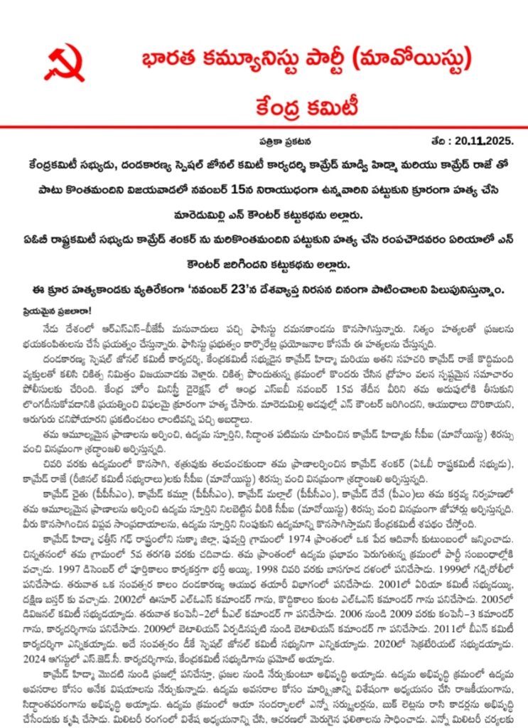 కేంద్రకమిటీ సభ్యుడు, దండకారణ్య స్పెషల్ జోనల్ కమిటీ కార్యదర్శి కామ్రేడ్ మాడ్వి హిడ్మా మరియు కామ్రేడ్ రాజే తో పాటు కొంతమందిని విజయవాడలో నవంబర్ 15 న నిరాయుధంగా ఉన్నవారిని పట్టుకుని క్రూరంగా హత్య చేసి మారెడుమిల్లి ఎన్ కౌంటర్ కట్టుకథను అల్లారు, ఏఓబీ రాష్ట్రకమిటీ సభ్యుడు కామ్రేడ్ శంకర్ ను మరికొంతమందిని పట్టుకుని హత్య చేసి రంపచౌడవరం ఏరియాలో ఎన్ కౌంటర్ జరిగిందని కట్టుకథను అల్లారు అని మావోయిస్టు పార్టీ కేంద్ర కమిటీ అధికార ప్రతినిధి, అభయ్ గురువారం విడుదల చేసిన పత్రిక ప్రకటనలో పేర్కొన్నారు.