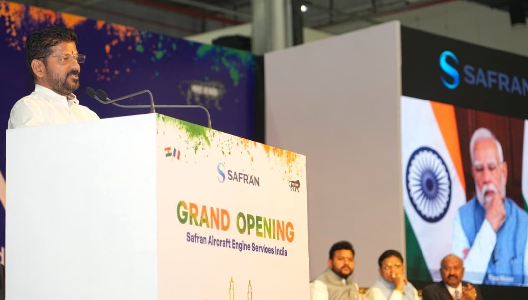 హైదరాబాద్లో సాఫ్రన్ ఎయిరోస్పేస్ ఫెసిలిటీ సెంటర్ను నెలకొల్పడం తెలంగాణ అభివృద్ధిలో ఒక మైలురాయిగా నిలుస్తుందని ముఖ్యమంత్రి రేవంత్ రెడ్డి వ్యాఖ్యానించారు. ఫ్రాన్స్కు చెందిన సాఫ్రన్ సంస్థ ఎయిర్ క్రాఫ్ట్ ఇంజిన్ సర్వీసెస్ ఇండియా హైదరాబాద్ జీఎంఆర్ ఎయిరోపార్క్ (ఎస్ఈజెడ్) లో నెలకొల్పిన ఫెసిలిటీ సెంటర్ ప్రారంభోత్సవ కార్యక్రమంలో బుధవారం ముఖ్యమంత్రి పాల్గొని ప్రసంగించారు.