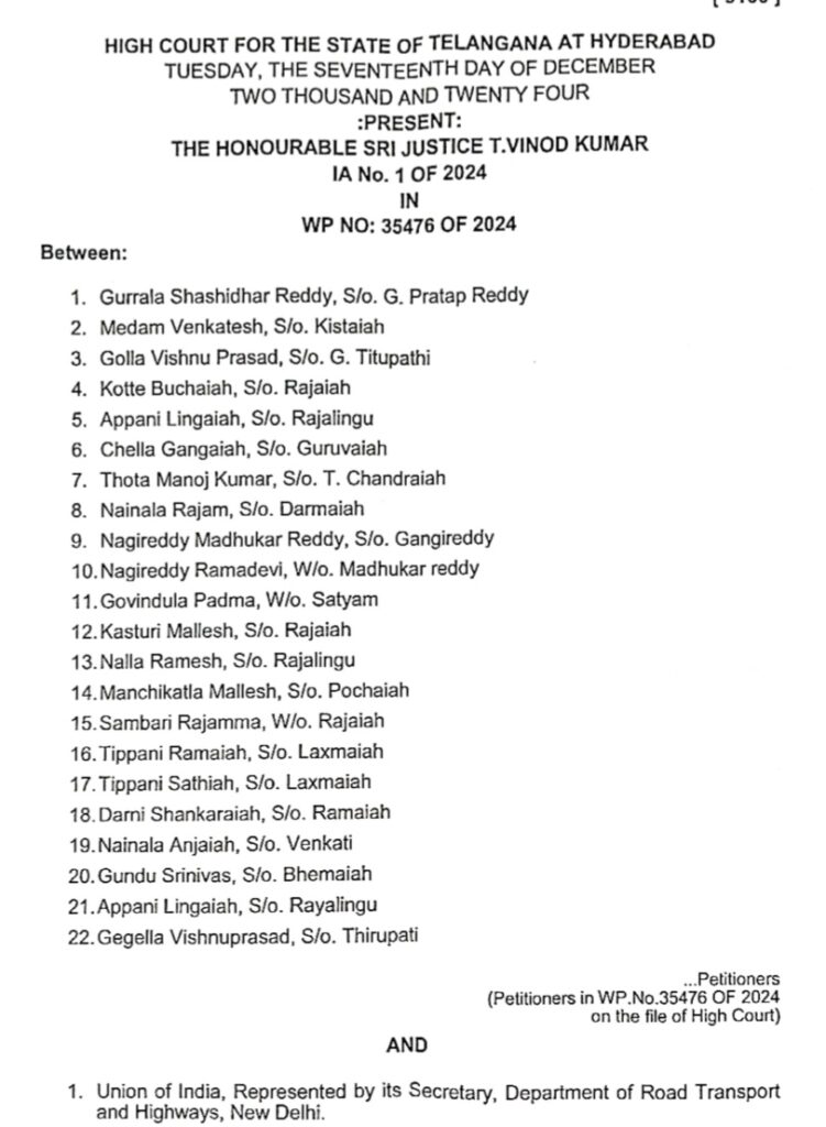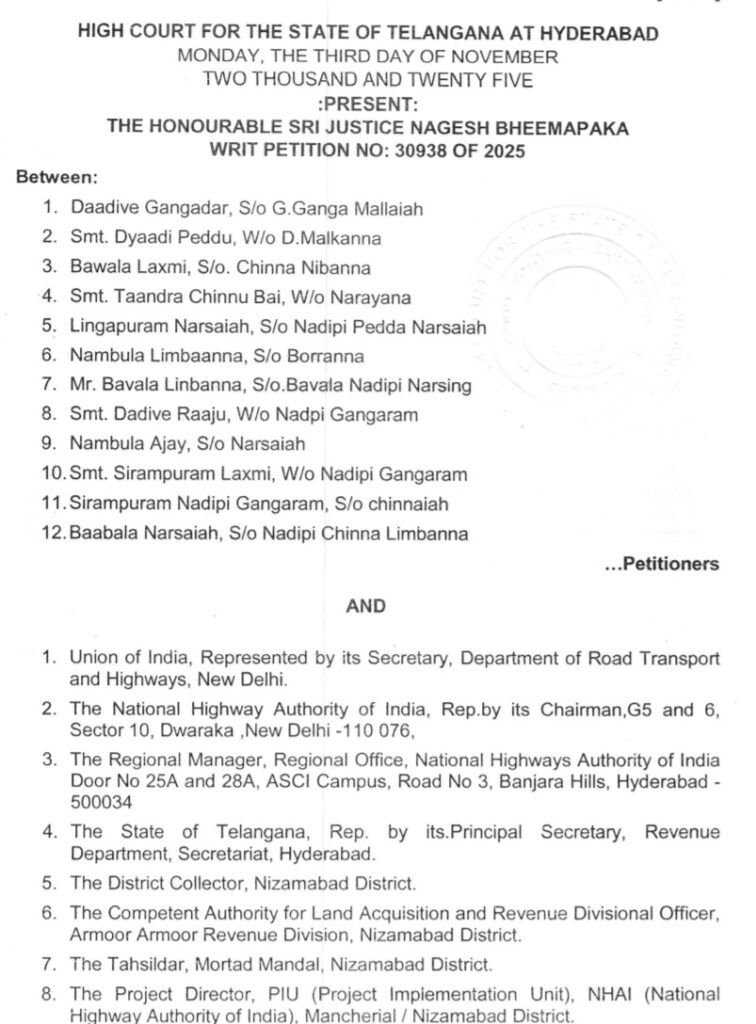 నేషనల్ హైవే ఆక్ట్ సెక్షన్ 3C ప్రకారం భూ నిర్వాసితులకు తీరని అన్యాయం జరుగుతుందని హై కోర్టు అడ్వకేట్ దొరిశెట్టి పోచయ్య హై కోర్టు లో డబ్ల్యు పి. నం.35476/2024 రిట్ పిటిషన్ దాఖలు చేసి వాదనలు వినిపించారు.