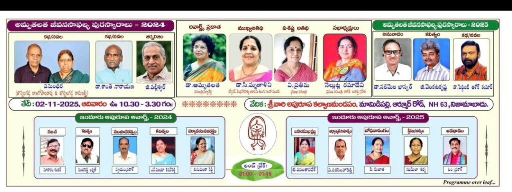 ‘ఇందూరు అపురూప’ అవార్డులను సూరారం శంకర్, పంచరెడ్డి లక్ష్మణ్, స్వయంప్రకాశ్, ఎన్. విజయా కిషన్ రెడ్డి, కుసుమలతా రెడ్డి, టి. వసంతా వివేక్, వి. నరసింహా రెడ్డి, పి. సుజాత, సుమీలా శర్మ, డా. బోచ్కర్ ఓం ప్రకాశ్ లకు బహూకరించారు. ఈ కార్యక్రమానికి ప్రముఖ రచయిత్రి వి. ప్రతిమ విశిష్ట అతిథిగా పాల్గొన్నారు.