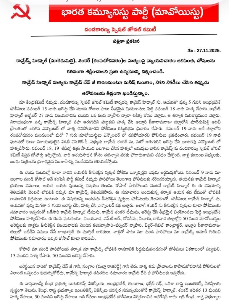 👉 మావోయిస్టు పార్టీ సుదీర్ఘ పత్రిక ప్రకటనలో కొన్ని వివరాలు ఇలా ఉన్నాయి..