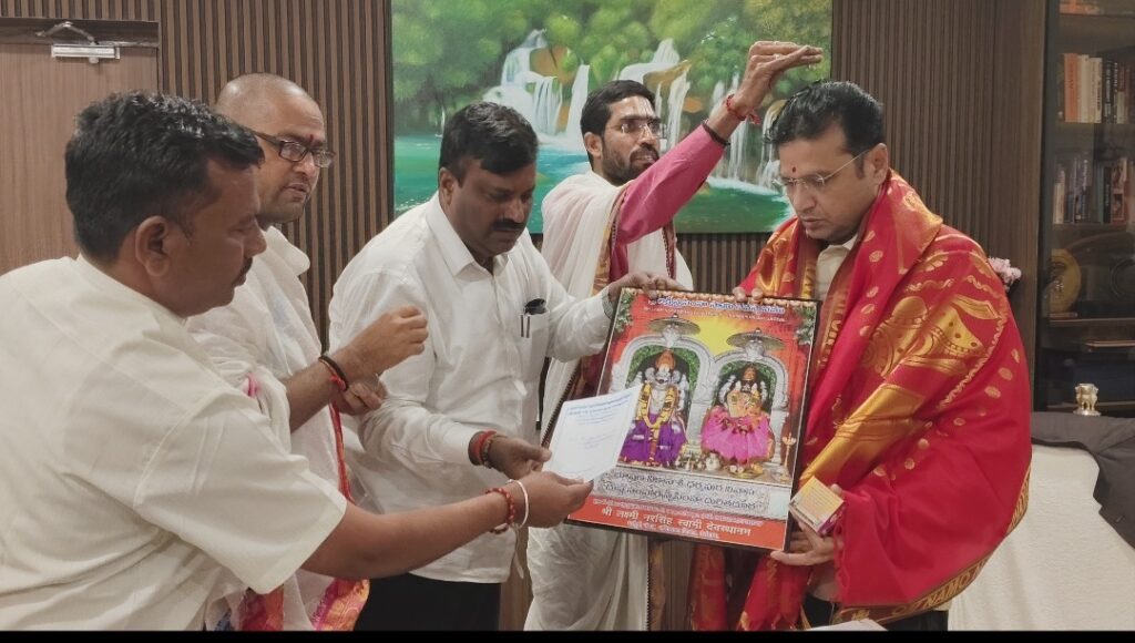సాయంత్రం హైదరాబాద్ లో రవాణా శాఖ మంత్రి పొన్నం ప్రభాకర్ గౌడ్ నివాసంలొ ఆలయ కార్యనిర్వహణాధికారి, అర్చకులు నంబి అరుణ్ కుమార్ , బొజ్జ రాజగోపాల్ సీనియర్ అసిస్టెంట్ అల్వాల శ్రీనివాస్ తో కలిసి ఆహ్వనం తో పాటు శేష వస్త్ర ప్రసాదం చిత్రపటం అందించారు.