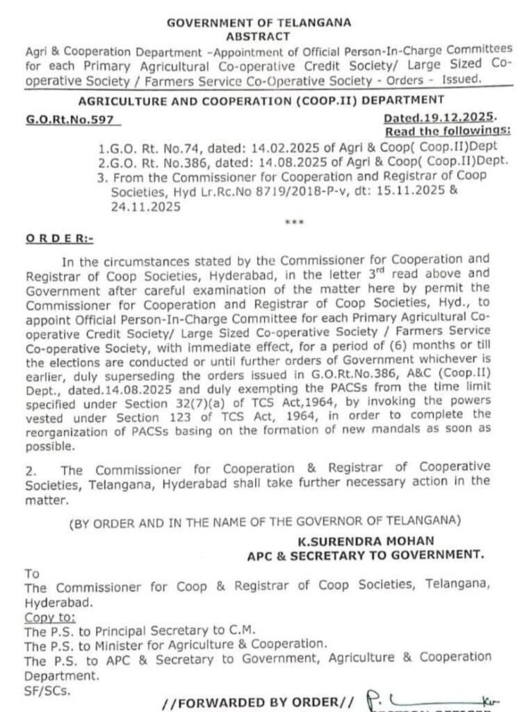 ప్రతి ప్రాథమిక వ్యవసాయ సహకార క్రెడిట్ సొసైటీ/ పెద్ద పరిమాణ సహకార సంఘం/ రైతు సేవా సహకార సంఘానికి అధికారిక పర్సన్-ఇన్-ఛార్జ్ కమిటీని తక్షణమే (6) నెలల పాటు లేదా, సొసైటీకి ఎన్నికలు నిర్వహించే వరకు లేదా, ప్రభుత్వం నుండి తదుపరి ఉత్తర్వులు ఏది ముందు వస్తే అది వరకు నియమించడానికి సహకార కమిషనర్ మరియు సహకార సంఘాల రిజిస్ట్రార్, కు ప్రభుత్వం అనుమతి ఇచ్చింది.