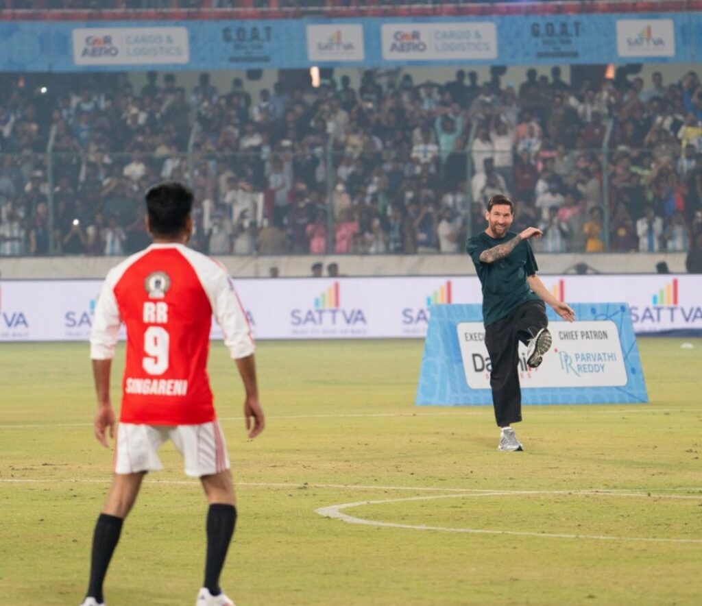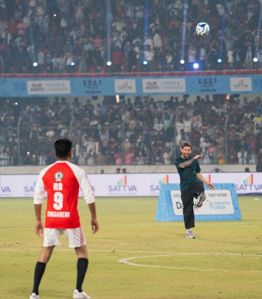 👉 ⚽ ఫుట్బాల్ దిగ్గజాలు రోడ్రిగో డి పాల్ (అర్జెంటీనా), లూయిస్ సువారెజ్ (ఉరుగ్వే) లతో కలిసి హైదరాబాద్ చేరుకున్న మెస్సీ స్టేడియంలో అడుగుపెట్టినప్పటి నుంచి చివరి వరకు గ్యాలరీలో ఉన్న క్రీడాభిమానులకు అభివాదం చేస్తూ వారిలో జోష్ నింపారు. ప్రారంభంలో సింగరేణి ఆర్ఆర్ 9 టీమ్కు, అపర్ణ ఆల్ స్టార్స్ టీమ్కు మధ్యన సాగిన ఎగ్జిబిషన్ మ్యాచ్ను మెస్సీ ఆసక్తిగా తిలకించారు.