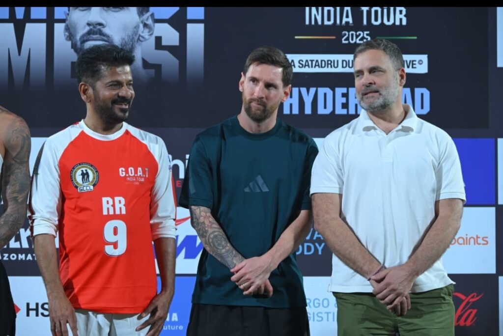 👉 ⚽ 14 సంవత్సరాల తర్వాత భారత్లో అడుగు పెట్టిన ఈ అర్జెంటీనా కెప్టెన్ లియోనెల్ మెస్సీ క్రీడాభిమానులను మెప్పించారు. మెస్సీ హైదరాబాద్ పర్యటన అత్యంత ఉత్సాహపూరిత వాతావరణంలో విజయవంతంగా సాగింది. మెస్సీతో పాటు హైదరాబాద్కు చేరుకున్న ఫుట్బాల్ క్రీడాకారులు రోడ్రిగో డిపాల్ (అర్జెంటీనా), లూయిస్ సువారెజ్ (ఉరుగ్వే) లు, రేవంత్ రెడ్డి మైదానంలోకి దిగిన సందర్భంలో మెస్సీ.. మెస్సీ.. అంటూ స్టేడియం దద్దరిల్లింది.