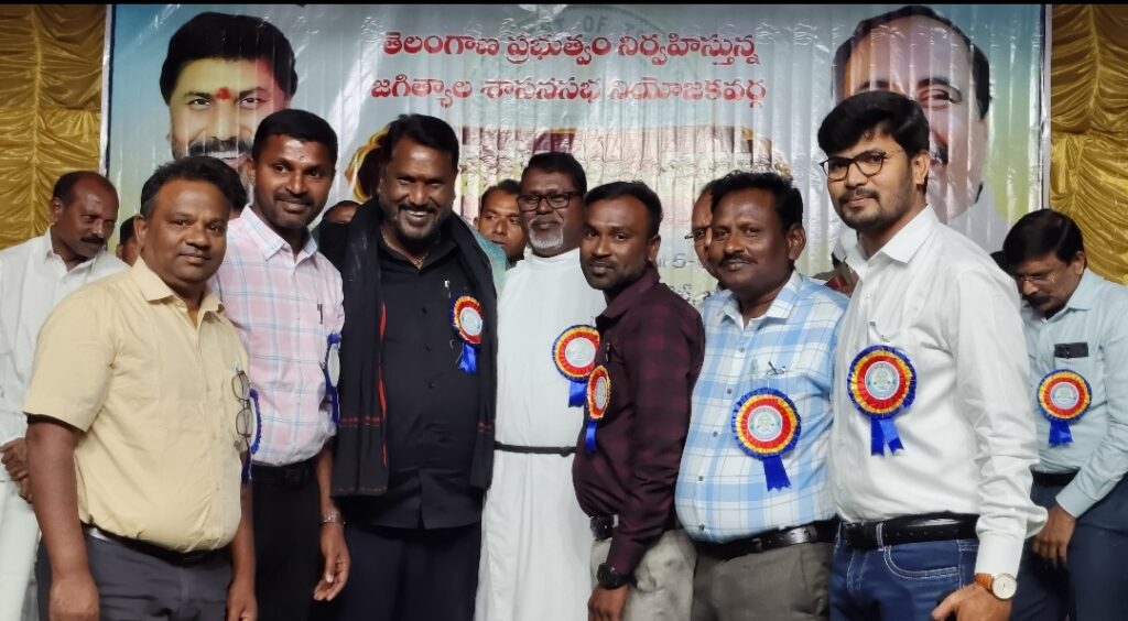 జగిత్యాల జిల్లా కేంద్రంలో స్థానిక మిషన్ కాంపౌండ్ కమ్యూనిటీ హాల్లో ఎవాంజెలిస్ట్ వెల్ఫేర్ అసోసియేషన్ ఆధ్వర్యంలో శుక్రవారం రాత్రి రాష్ట్ర ప్రభుత్వ పక్షాన ఏర్పాటు చేసిన జగిత్యాల నియోజకవర్గ క్రిస్మస్ వేడుకల్లో స్థానిక ఎమ్మెల్యే సంజయ్ కుమార్ , జిల్లా కలెక్టర్ సత్య ప్రసాద్ , జిల్లా కాంగ్రెస్ కమిటీ అధ్యక్షుడు గాజంగి నందయ్యతో కలిసి మంత్రి అడ్లూరి లక్ష్మణ్ కుమార్ పాల్గొన్నారు.