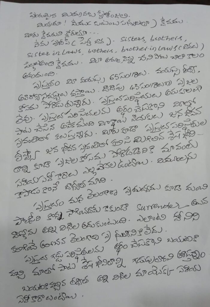 ” మీ వయస్సు 65 సంవత్సరాలు ఆరోగ్య పరిస్థితులు, మీ తోటి కామ్రేడ్స్ జన జీవన స్రవంతిలో కలిశారు, వారు ఇచ్చిన సమాచారంతో మీరు ఒడిస్సాలో ఉన్నట్టు తెలిసింది. తెలంగాణ ప్రభుత్వం లొంగుబాటుకు సానుకూలంగా ఉంది మీరు ఎక్కడ ఉన్నా లొంగిపొండి,” అంటూ మావోయిస్టు కేంద్ర కమిటీ సభ్యుడు