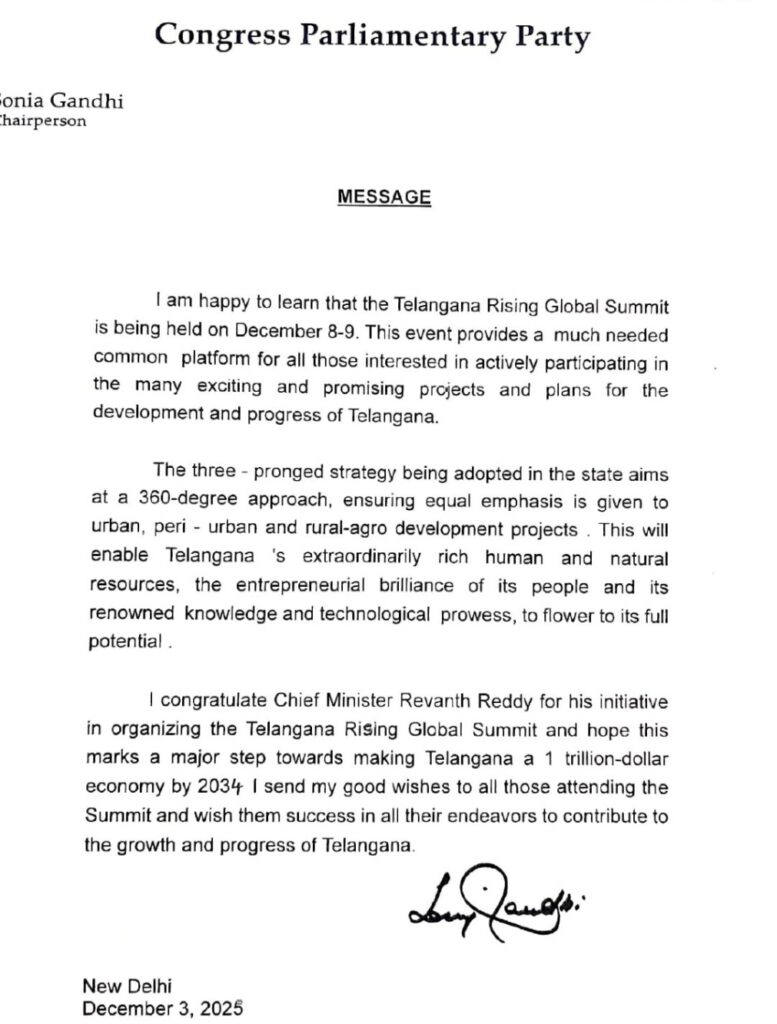 👉 అర్బన్, సెమీ అర్బన్, గ్రామీణ–వ్యవసాయాభివృద్ధి ప్రాజెక్టులకు సమ ప్రాధాన్యం ఇస్తూ మూడంచెల వ్యూహంతో తెలంగాణ ముందుకు సాగుతోందని ఆ లేఖలో ప్రస్తావించారు. తెలంగాణలోని మానవ వనరులు, సహజ వనరులు, ప్రజల వ్యాపార నైపుణ్యం, అంతర్జాతీయ ప్రతిభ, సాంకేతిక నైపుణ్యాల అభివృద్ధికి సదస్సు మరింత తోడ్పడుతుందని అన్నారు. సదస్సులో పాల్గొంటున్న వారందరికీ సోనియా గాంధీ శుభాభినందనలు తెలిపారు.