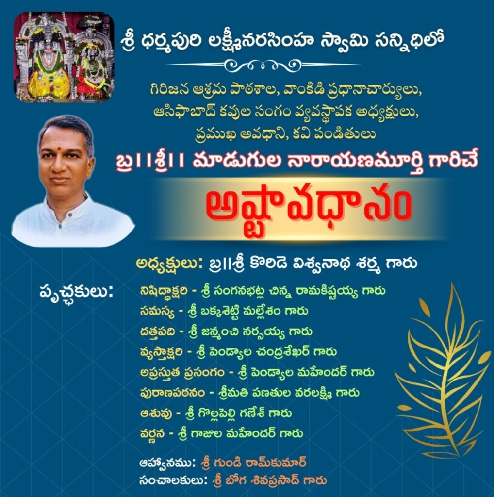 ప్రసిద్ధ పుణ్యక్షేత్రమైన ధర్మపురి శ్రీ లక్ష్మీనరసింహ స్వామి వారి సన్నిధిలో, అన్నపూర్ణ సేవా సమితి సౌజన్యంతో శనివారం సాయంత్రం జరిగిన ‘అష్టావధానం’ సాహితీ ప్రియులను ఎంతగానో ఆకట్టుకుంది. ధర్మపురి సాహితీ మిత్రబృందం ఆధ్వర్యంలో స్థానిక శేషప్ప కళావేదికలో ఈ కార్యక్రమం కన్నుల పండుగగా సాగింది.