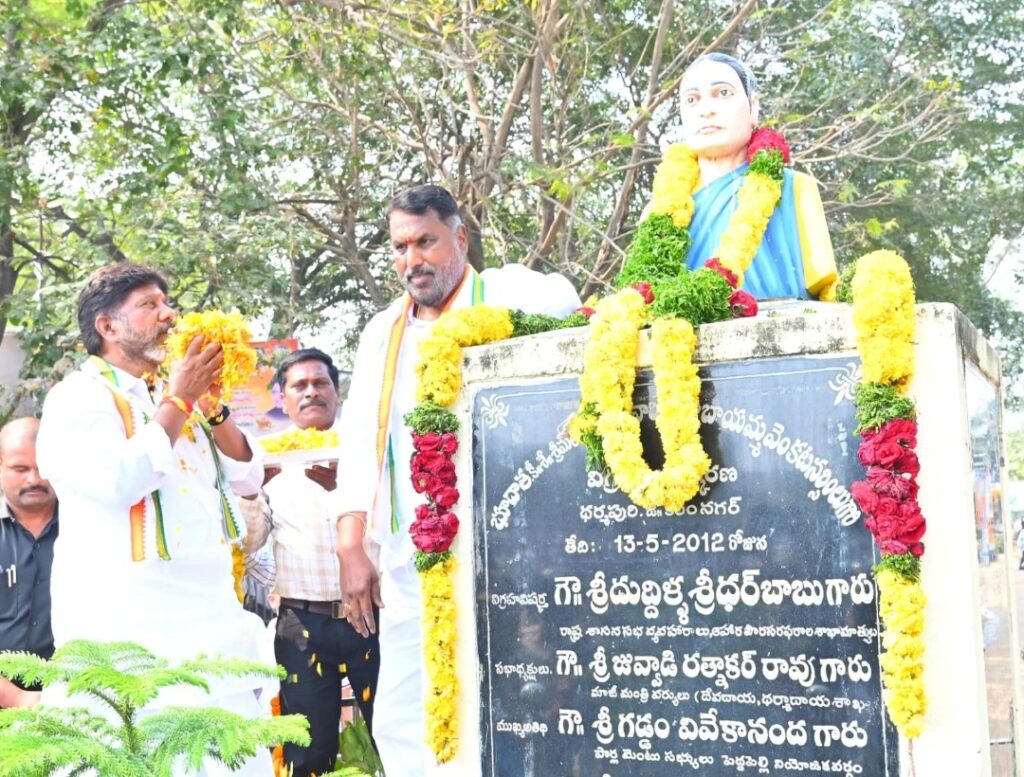 కోట్లాది రూపాయలు విలువగల భూమిని విద్యా సంస్థకు దానమిచ్చిన స్వర్గీయ మధ్వాచారీ రాధా బాయి అమ్మ విగ్రహానికి మంత్రులు నివాళులర్పించారు.