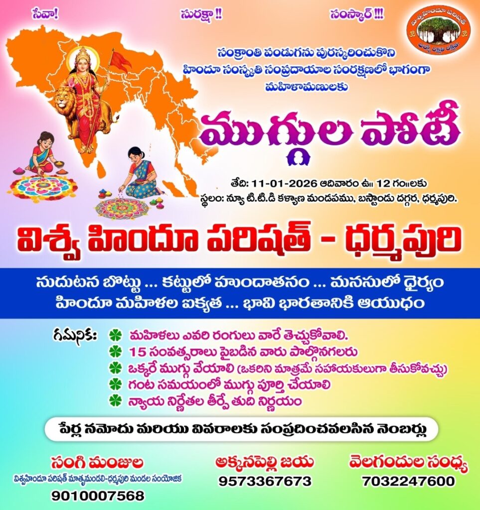 హిందూ సంస్కృతి సాంప్రదాయాల పరిరక్షణలో భాగంగా మహిళా సోదరీమణులకు సంక్రాంతి పర్వదినం పురస్కరించుకొని విశ్వహిందూ పరిషత్ ఆధ్వర్యంలో ధర్మపురి క్షేత్రంలో ముగ్గుల పోటీ నిర్వహిస్తున్నట్టు నిర్వాహకులు తెలిపారు..