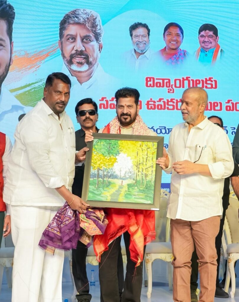 👉 దివ్యాంగుల సహకార సంస్థ ఆధ్వర్యంలో ఏర్పాటు చేసిన ఈ కార్యక్రమంలో దివ్యాంగులకు ముఖ్యమంత్రి చేతుల మీదుగా రెట్రోఫిట్టెడ్ మోటరైజ్డ్ వాహనాలు, బ్యాటరీతో నడిచే త్రిచక్ర వాహనాలు, బ్యాటరీ వీల్ చైర్లు, ల్యాప్టాప్లు, వినికిడి యంత్రాలు, మొబైల్ ఫోన్లు, ఇతర పరికరాలను పంపిణీ చేశారు.