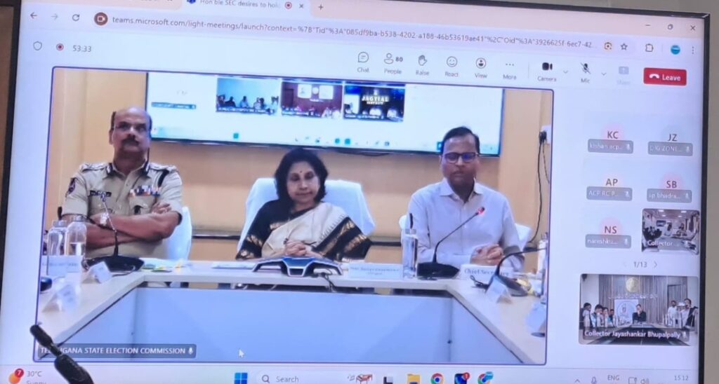 రెండవ సాధారణ మున్సిపల్ ఎన్నికలపై జిల్లా కలెక్టర్లు మరియు ఎస్పీలతో మంగళవారం వీడియో కాన్ఫరెన్స్ నిర్వహించిన రాష్ట్ర ఎన్నికల కమిషనర్ రాణి కుముదిని. ఇందులో రాష్ట్ర ప్రభుత్వ ప్రధాన కార్యదర్శి కె. రామకృష్ణ రావు మరియు రాష్ట్ర DGP బి. శివధర్ రెడ్డి పాల్గొన్నారు.