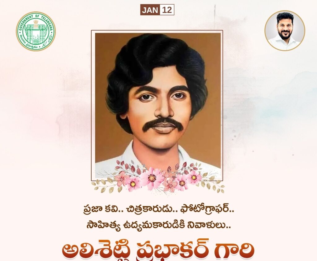 ప్రజా కవి, చిత్రకారుడు, ఫోటోగ్రాఫర్, ఉద్యమకారుడు అలిశెట్టి ప్రభాకర్ గారి జయంతి/వర్ధంతి సందర్భంగా ముఖ్యమంత్రి రేవంత్ రెడ్డి ఆ అక్షరయోధుడికి నివాళులర్పించారు. ప్రజల సమస్యలను తన రచనల ద్వారా నిర్భయంగా వ్యక్తపరిచిన అలిశెట్టి ప్రభాకర్ గారు సమాజ మార్పు కోసం జీవితాంతం పోరాడారని ఆయన స్మరించుకున్నారు.