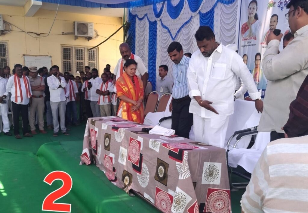 వేదిక పైకి మంత్రి, అడిషనల్ కలెక్టర్ మున్సిపల్ కమిషనర్, తాసిల్దార్ చేరుకొని తమ తమ కుర్చీల వద్దకు చేరుకున్నారు. చైర్ పర్సన్ కు పలువురు శుభాకాంక్షలు, అభినందనలు, చెప్పడానికి రావడంతో ఆమె తన చాంబర్ నుంచి బయటికి రావడానికి ఆలస్యమైంది. చైర్ పర్సన్ కు కౌన్సిలర్లు ,మున్సిపల్ సిబ్బంది, సమాచార ఇవ్వడంతో ఆమె పరుగున వేదిక వద్దకు చేరుకుంది.