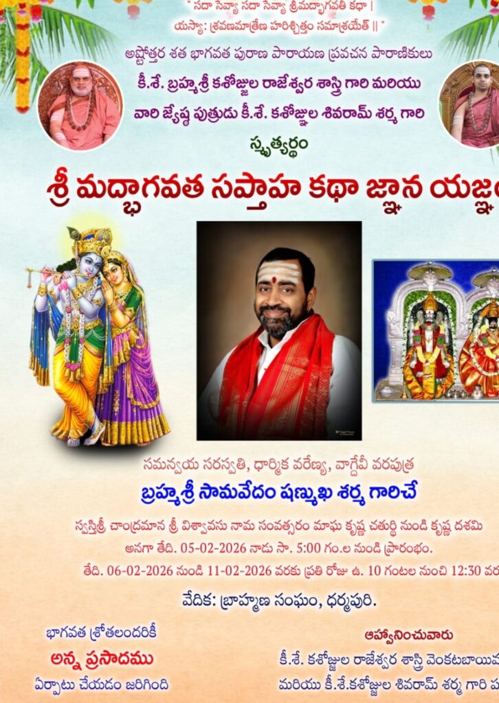 ప్రముఖ పుణ్యక్షేత్రమైన ధర్మపురి లోని బ్రాహ్మణ సంఘం భవన ప్రాంగణంలో నేటి నుంచి ( గురువారం) బ్రహ్మశ్రీ సామవేదం షణ్ముఖ శర్మ భాగవత సప్తాహం ఆరంభం కానున్నది. బ్రహ్మశ్రీ కశోజ్జల రాజన్న శాస్త్రి,వెంకవాయమ్మ జ్యేష్ట పుత్రుడు,కషోజ్జల శివరామ్ స్మృత్యర్థం. భాగవసప్తహ కార్యక్రమం వారి కుటుంబ సభ్యులు కార్యక్రమాన్ని నిర్వహిస్తున్నారు.