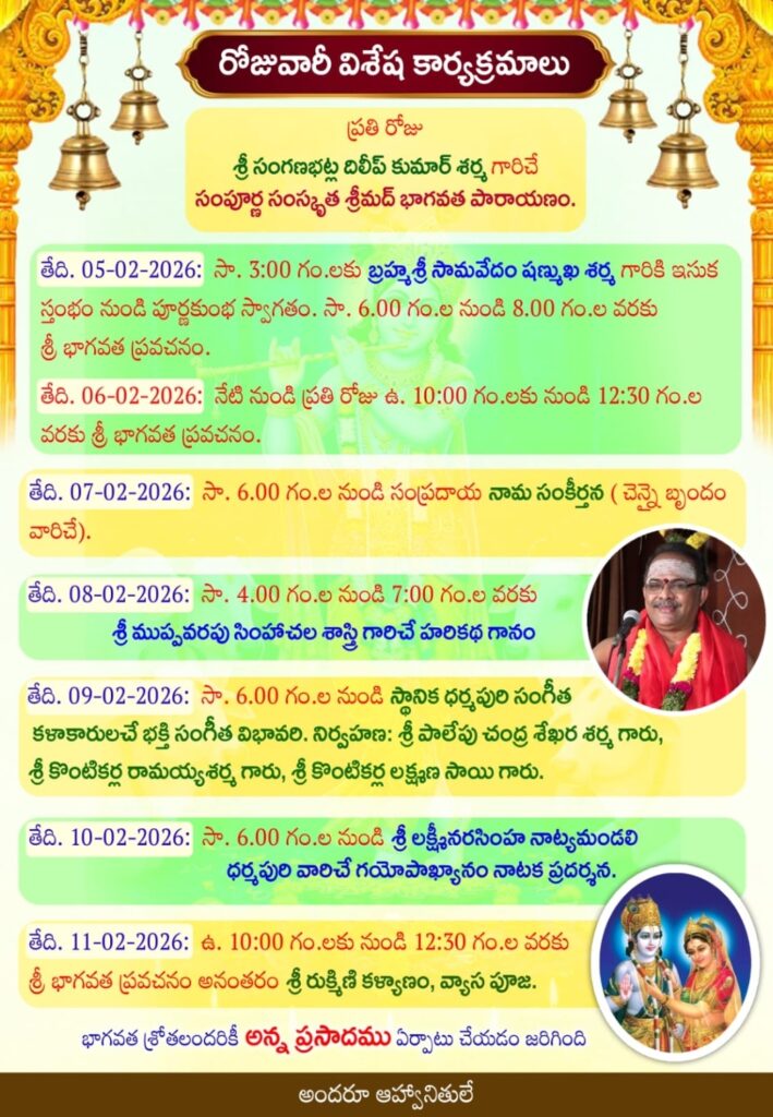 బ్రహ్మశ్రీ సామవేదం షణ్ముఖ శర్మ సాయంత్రం ధర్మపురి క్షేత్రానికి రానున్నారు. కార్యక్రమం ప్రతిరోజు ఉదయం 09.30 నుంచి 12.00 మధ్యాహ్నం వరకూ భాగవత సప్తాహ ప్రవచన కార్యక్రమం కొనసాగుతుంది.