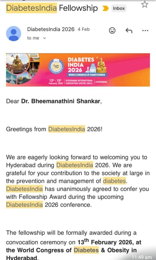 హైదరాబాద్ లోని ఇంటర్నేషనల్ కన్వెన్షన్ సెంటర్ లో డయాబెటిస్ ఇండియా చాప్టర్ ఆధ్వర్యంలో ఈనెల 13 నుండి 15 వరకు జరిగే “ప్రపంచ మధుమేహ మహాసభ “ లో డాక్టర్ భీమనాతి శంకర్ (ఎండి ) కి ఇవ్వనున్నారు..