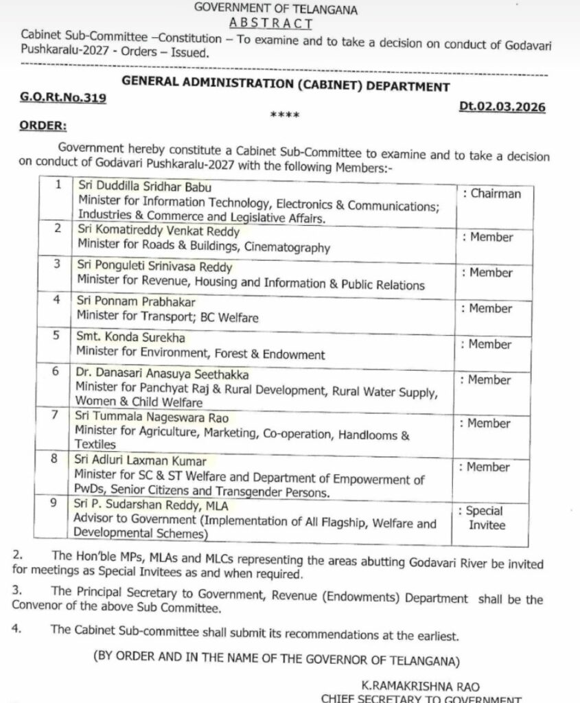 2027 గోదావరి పుష్కరాల నిర్వహణపై ముందస్తుగా పరిశీలించి నిర్ణయం తీసుకోవడానికి తెలంగాణ ప్రభుత్వం క్యాబినెట్ సబ్-కమిటీ ఈనెల 2న ప్రభుత్వ ఉత్తర్వు సంఖ్య 319 ద్వారా ప్రభుత్వ ప్రధాన కార్యదర్శి రామకృష్ణారావు ఉత్తర్వులు జారీ చేశారు..