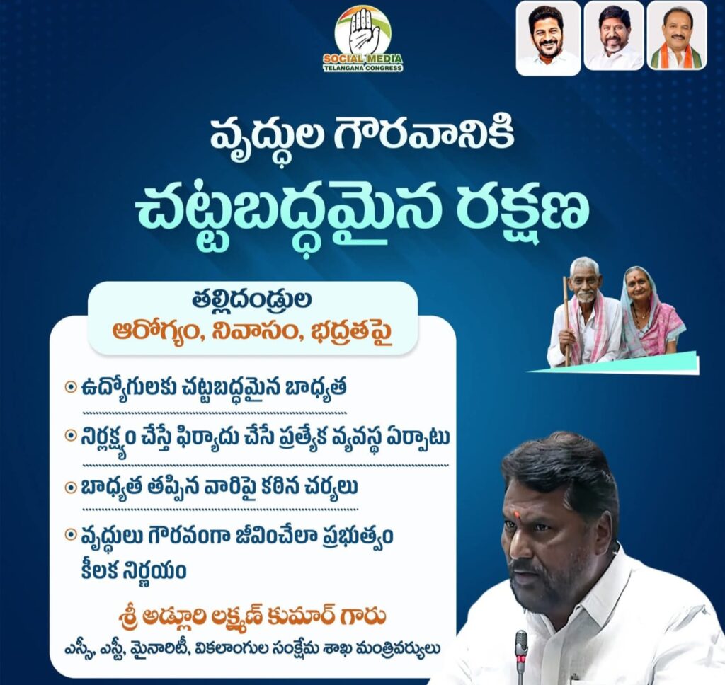 దేశ చరిత్రలోనే అరుదైన ఆలోచనగా ఈ నిర్ణయాన్ని కొనియాడారు. వృద్ధ తల్లిదండ్రుల సమస్యలను లోతుగా అర్థం చేసుకుని, వాటికి శాశ్వత పరిష్కారం చూపేలా సీఎం రేవంత్ రెడ్డి తీసుకున్న ఈ నిర్ణయం ఆదర్శప్రాయమని పేర్కొన్నారు.