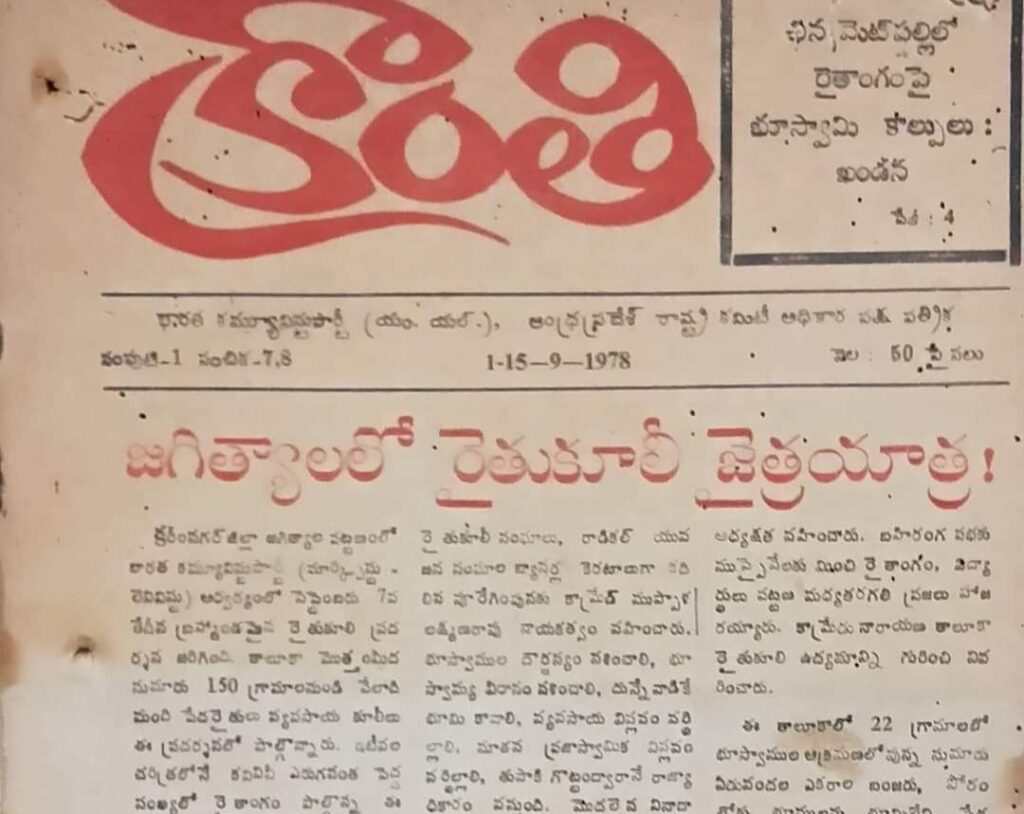 పోరాటాల పురిటి గడ్డ జగిత్యాలకు పోరాటాల ఉద్యమ చరిత్ర లో ప్రత్యేక స్థానం ఉంది.. 1978 సెప్టెంబర్ 9 భూమికోసం, భుక్తి కోసం వెట్టి చాకిరి విముక్తి కోసం లక్షలాది మంది రైతు కూలీల ఆధ్వర్యంలో జగిత్యాల పట్టణంలో జరిగిన భారీ బహిరంగ సభకు జగిత్యాల్ జైత్రయాత్రగా పేరు. ఈ సభకు ముక్కు సుబ్బారెడ్డి అధ్యక్షత వహించగా, ఈ సభలో ప్రజా యుద్ధ నౌక, స్వర్గీయ గద్దర్ గజ్జ కట్టి ఆడారు పాడారు. నక్సలైట్ ఉద్యమానికి, ఉద్యమ నాయకత్వానికి జగిత్యాల జైత్రయాత్ర ఉగ్గుపాలతో ఊపిరి పోసిందని, నక్సల్స్, మావోయిస్టు ఉద్యమానికి జగిత్యాల జైత్రయాత్ర ఓ ప్రయోగశాలగా చర్చ. రైతు కూలీల భారీ బహిరంగ సభ అనంతరం నాటి ప్రభుత్వం జగిత్యాలను కల్లోలిత ప్రాంతంగా ప్రకటించింది.