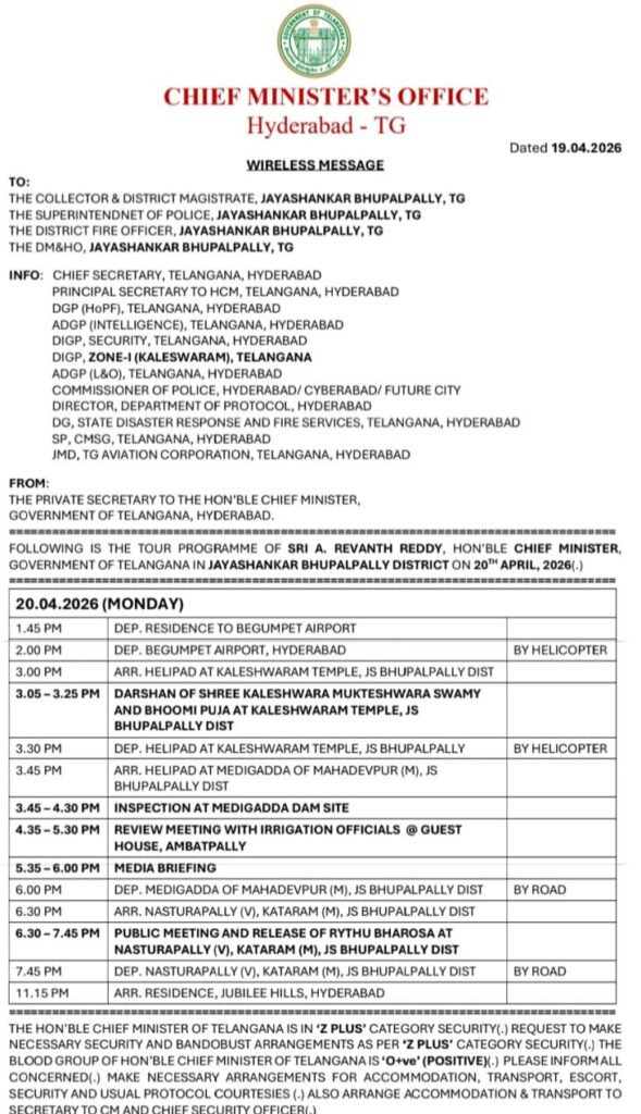 👉 3.30 గంటలకు కాలేశ్వరం నుంచి బయలుదేరి 3.45 గంటలకు మహాదేవపూర్ మండలం మేడిగడ్డకు చేరుకుంటారు.