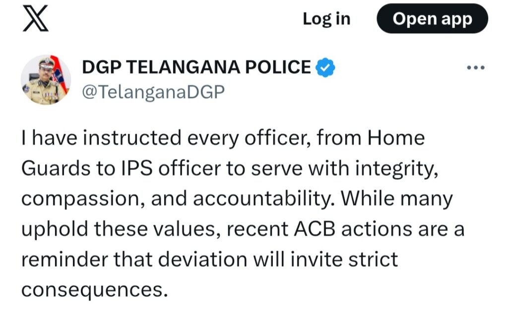 “యూనిఫాం, అవినీతి రెండూ కలిసి ఉండలేవు.. ..శాంతి భద్రతలను కాపాడవలసిన వారు అక్రమ సంపాదనకు అలవాటు పడితే కఠిన చర్యలు తప్పవు” అంటూ బాధ్యతలు చేపట్టిన వెంటనే డైరెక్టర్ జనరల్ అఫ్ పోలీస్ బి. శివధర్ రెడ్డి రాష్ట్రంలోని పోలీసు సిబ్బందికి రాసిన లేఖలో అత్యంత స్పష్టంగా హెచ్చరించారు.