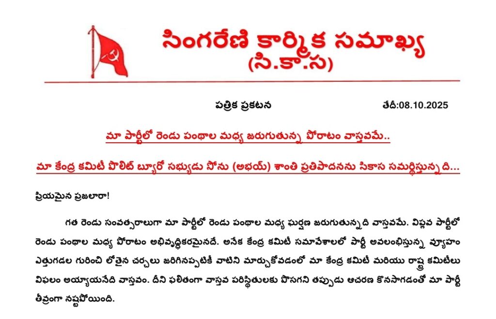 👉 సింగరేణి కార్మిక సమాఖ్య (సికాస) ప్రకటన ! 👉 సికాస మావోయిస్టు పార్టీ మిలిటెంట్ ట్రేడ్ యూనియన్ ! J.SURENDER…